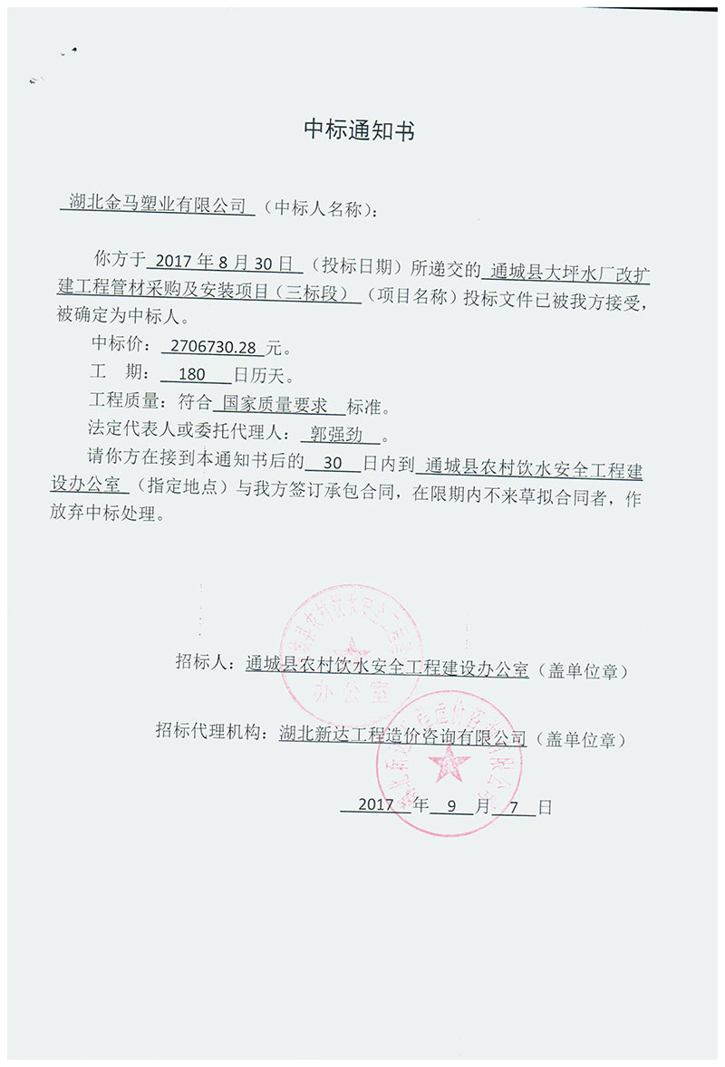 祝賀金馬塑業(yè)中標(biāo)通城縣大坪水廠改擴(kuò)建工程管材采購及安裝項(xiàng)目