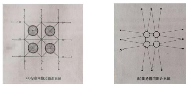 HDPE圓形雙浮管浮式深水網箱的錯泊系統(tǒng)比較簡單。比較科學的錯泊系統(tǒng)是參照升降式深水網箱的水下網格式布局,如圖1-7所示。