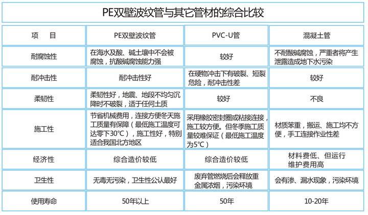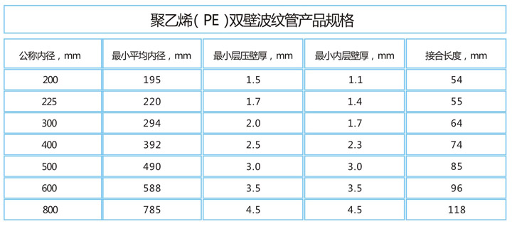 我司生產(chǎn)的HDPE雙壁波紋管材是以PE改性專用料為原料的一種新型輕質(zhì)管材,具有重量輕、耐高壓、韌性好、施工快壽命長等特點,其優(yōu)異的管壁結(jié)構(gòu)設(shè)計,與其他結(jié)構(gòu)的管材相比,成本大大降低。并且由于連接方便、可靠,在國內(nèi)外得到廣泛應(yīng)用。大量替代混凝土管和鑄鐵管。 管材規(guī)格尺寸,性能符合GB/T 19472.1-2004《埋地用聚乙烯(PE)結(jié)構(gòu)壁管道系統(tǒng)第一部分:聚乙烯雙壁波紋管管材》標準的要求。彈性密封符合HG/T 3091-2000的要求。